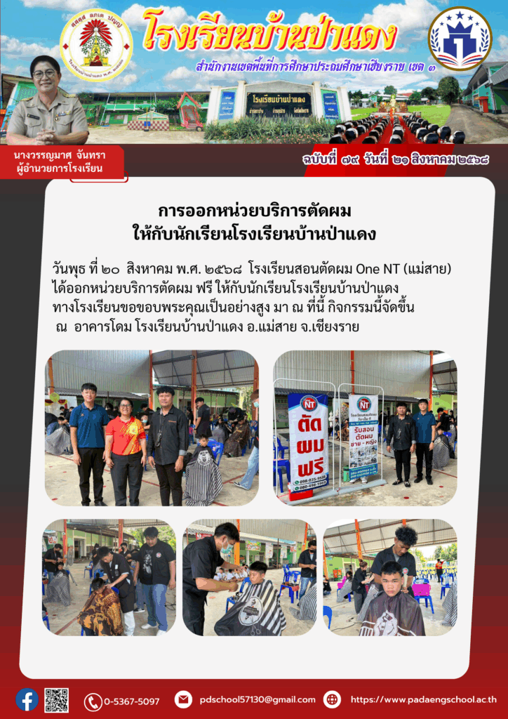 วันพุธ ที่ ๒๐ สิงหาคม พ.ศ. ๒๕๖๘ โรงเรียนสอนตัดผม One NT (แม่สาย) ได้ออกหน่วยบริการตัดผม ฟรี ให้กับนักเรียนโรงเรียนบ้านป่าแดง ทางโรงเรียนขอขอบพระคุณเป็นอย่างสูง มา ณ ที่นี้ กิจกรรมนี้จัดขึ้น ณ อาคารโดม โรงเรียนบ้านป่าแดง อ.แม่สาย จ.เชียงราย