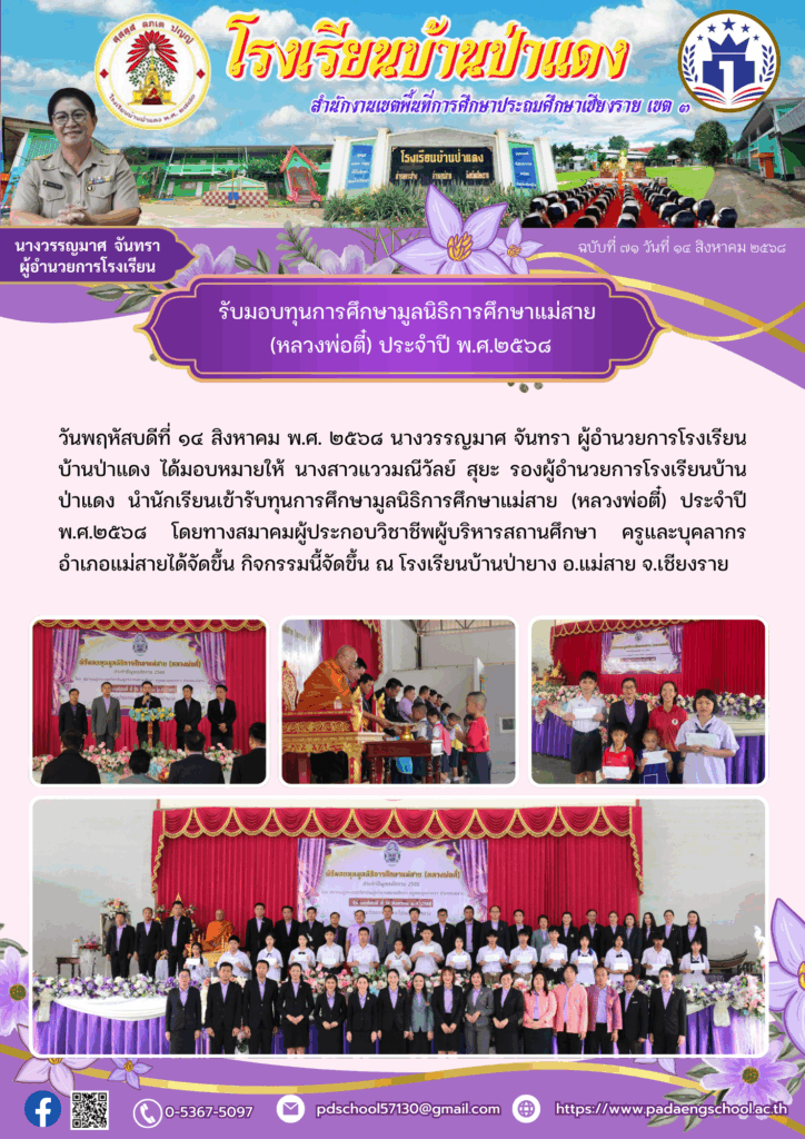 วันพฤหัสบดีที่ ๑๔ สิงหาคม พ.ศ. ๒๕๖๘ นางวรรญมาศ จันทรา ผู้อำนวยการโรงเรียนบ้านป่าแดง ได้มอบหมายให้ นางสาวแววมณีวัลย์ สุยะ รองผู้อำนวยการโรงเรียนบ้านป่าแดง นำนักเรียนเข้ารับทุนการศึกษามูลนิธิการศึกษาแม่สาย (หลวงพ่อตี๋) ประจำปี พ.ศ.๒๕๖๘ โดยทางสมาคมผู้ประกอบวิชาชีพผู้บริหารสถานศึกษา ครูและบุคลากรอำเภอแม่สายได้จัดขึ้น กิจกรรมนี้จัดขึ้น ณ โรงเรียนบ้านป่ายาง อ.แม่สาย จ.เชียงราย