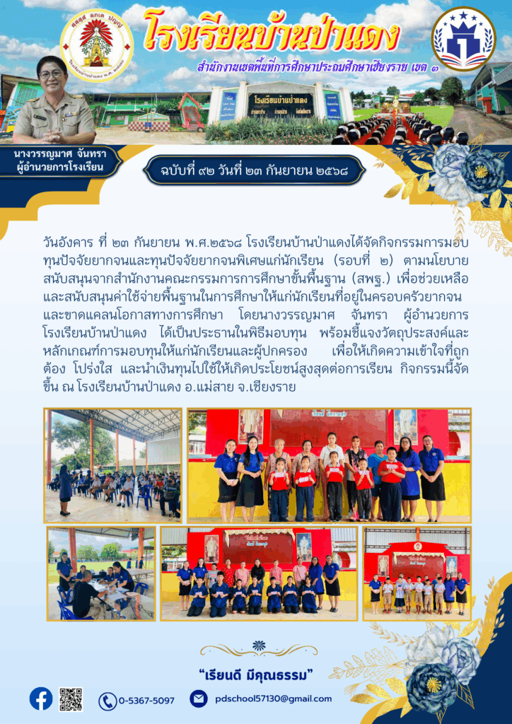 วันอังคาร ที่ 23 กันยายน พ.ศ.2568 โรงเรียนบ้านป่าแดงได้จัดกิจกรรมการมอบทุนปัจจัยยากจนและทุนปัจจัยยากจนพิเศษแก่นักเรียน (รอบที่ 2) ตามนโยบายสนับสนุนจากสำนักงานคณะกรรมการการศึกษาขั้นพื้นฐาน (สพฐ.) เพื่อช่วยเหลือและสนับสนุนค่าใช้จ่ายพื้นฐานในการศึกษาให้แก่นักเรียนที่อยู่ในครอบครัวยากจน และขาดแคลนโอกาสทางการศึกษา โดยนางวรรญมาศ จันทรา ผู้อำนวยการโรงเรียนบ้านป่าแดง ได้เป็นประธานในพิธีมอบทุน พร้อมชี้แจงวัตถุประสงค์และหลักเกณฑ์การมอบทุนให้แก่นักเรียนและผู้ปกครอง เพื่อให้เกิดความเข้าใจที่ถูกต้อง โปร่งใส และนำเงินทุนไปใช้ให้เกิดประโยชน์สูงสุดต่อการเรียน กิจกรรมนี้จัดขึ้น ณ โรงเรียนบ้านป่าแดง อ.แม่สาย จ.เชียงราย