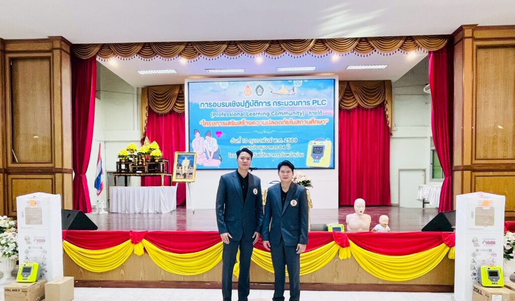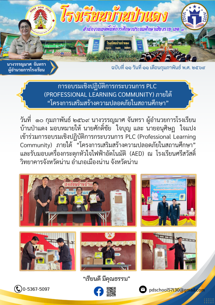 วันที่ ๑๐ กุมภาพันธ์ ๒๕๖๙ นางวรรญมาศ จันทรา ผู้อำนวยการโรงเรียนบ้านป่าแดง มอบหมายให้ นายศักดิ์ชัย ใจบุญ และ นายอนุศิษฏ ใจแปง เข้าร่วมการอบรมเชิงปฏิบัติการกระบวนการ PLC (Professional Learning Community) ภายใต้ “โครงการเสริมสร้างความปลอดภัยในสถานศึกษา” และรับมอบเครื่องกระตุกหัวใจไฟฟ้าอัตโนมัติ (AED) ณ โรงเรียนศรีสวัสดิ์วิทยาคารจังหวัดน่าน อำเภอเมืองน่าน จังหวัดน่าน